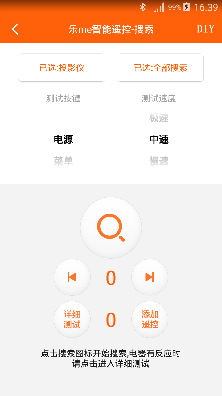 点击详细测试,可进入遥控器界面全面测试各个按钮是否有效,如果都能正常使用,返回搜索界面,可点击添加遥控,将此遥控添加到您的遥控列表中,部分按钮不正常则说明,此数据与您的电器不完全匹配,需要按搜索按钮继续向后搜索测试。