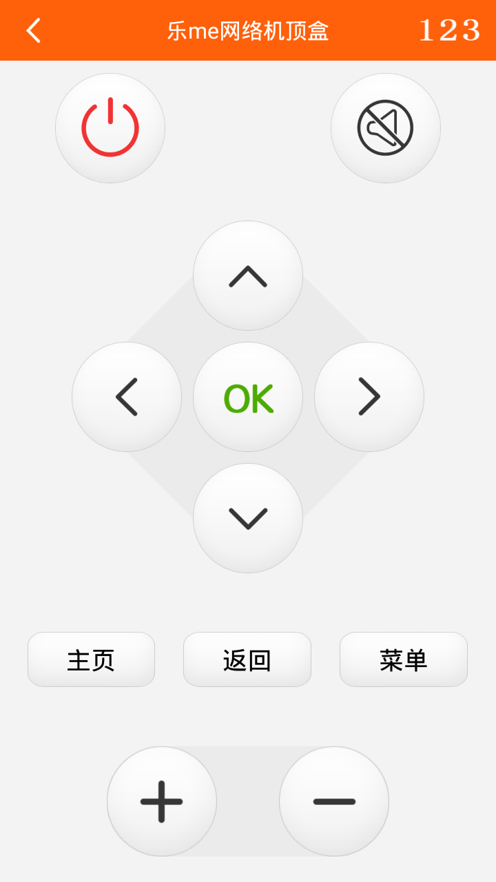 点击左上角的“<”返回主界面,右上角显示“123”时,此遥控器有数字或扩展按键,点击此按钮或在屏幕上滑动屏幕可以显示扩展按键,点击按钮,即可操控电器,长按按钮即可重复发送编码。