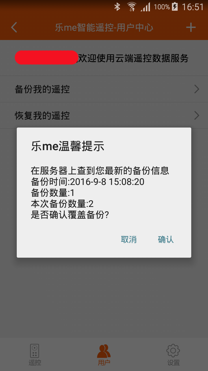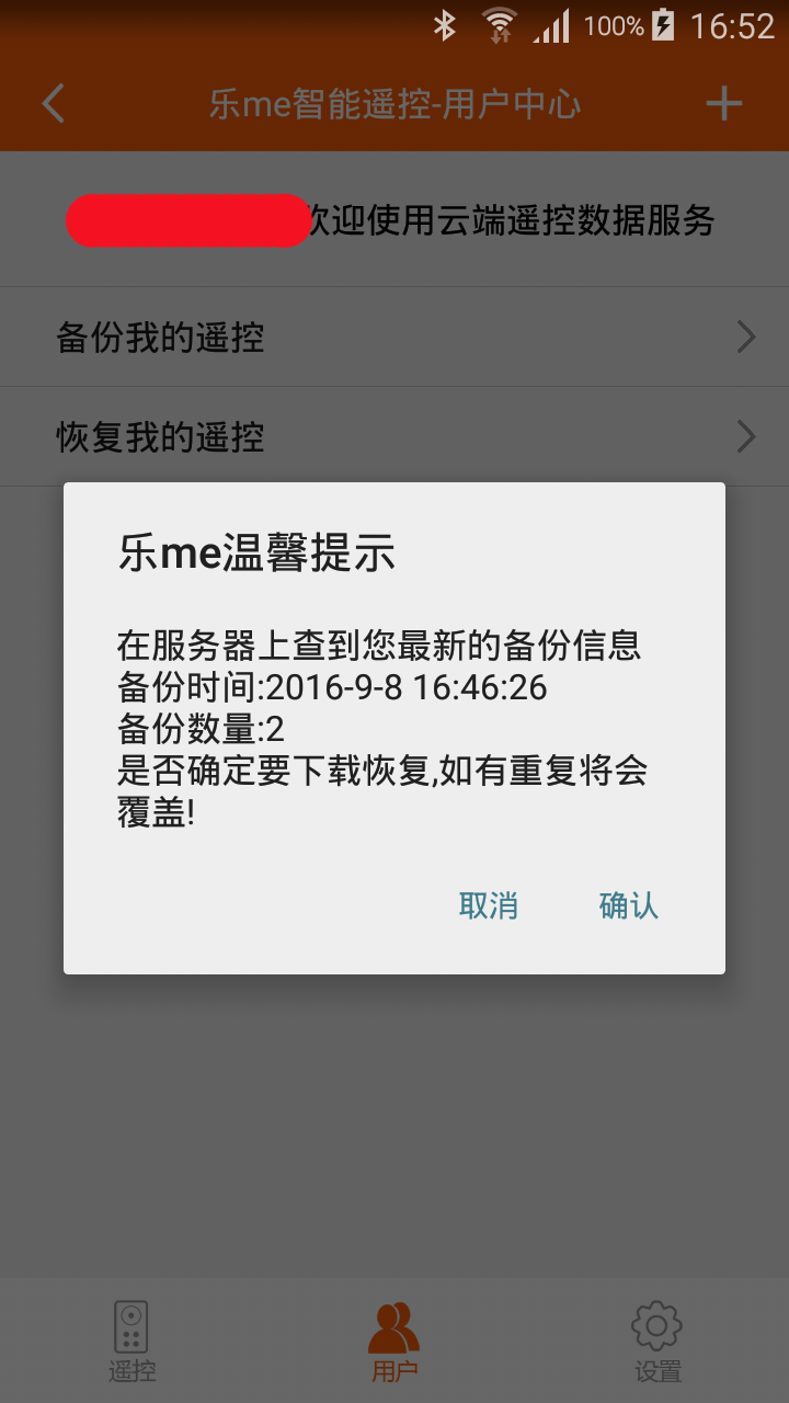 点击确认后开始备份,备份完成后,会提示您是否成功,备份成功后,您就可以使用其它手机登录您的账号进行恢复遥控列表。
